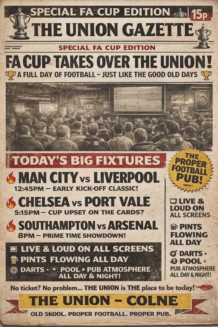 ⚽️ FA CUP TAKEOVER AT THE UNION! ⚽️ It’s football the way it should be… 🍻 loud, proud, and packed from start to finish! 🔥 Today’s BIG fixtures: 12:45PM – Man City vs Liverpool 5:15PM – Chelsea vs Port Vale 8PM – Southampton vs Arsenal 📺 LIVE & LOUD on all screens 🍺 Pints flowing ALL day 🎯 Darts • 🎱 Pool • Proper pub atmosphere No ticket? No problem… 👉 The Union Colne is THE place to be today! Old school football. Proper pub. Unmatched vibes. #FACup #MatchDay #TheUnionColne #FootballDay #PubVibes The Union