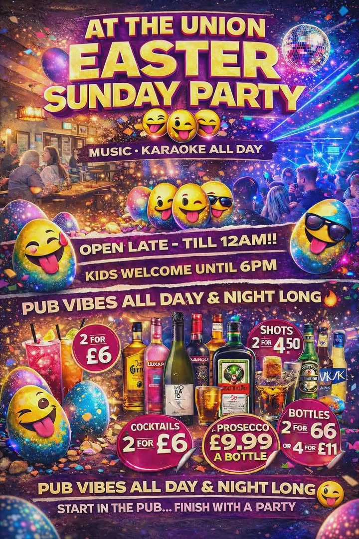 🔥 SUPER EASTER WEEKENDER AT THE UNION 🔥 Colne… this is the one you’ve been waiting for 👀 🐣 4 DAYS OF NON-STOP PARTY VIBES 🎤 Karaoke till 4AM ALL WEEKEND 🎶 DJs | Old Skool | Party Anthems 🍹 Unreal drink deals all weekend long 💥 GOOD FRIDAY – DJ Scotty Boy bringing the classics 💥 EASTER SATURDAY – James Sempie with old skool bangers 💥 EASTER SUNDAY – Big tunes, big atmosphere & proper pub vibes 📱 PLUS… get involved with our LIVE TikTok… you might just go viral 😏 One building. Two venues. ONE MASSIVE PARTY. 🚨 FREE ENTRY | OPEN LATE 🚨 Grab your crew and let’s make it a weekend to remember 🍻🔥 #UnionColne #EasterWeekend #ColneNights #PartyVibes #Nightclub #PubLife The Union